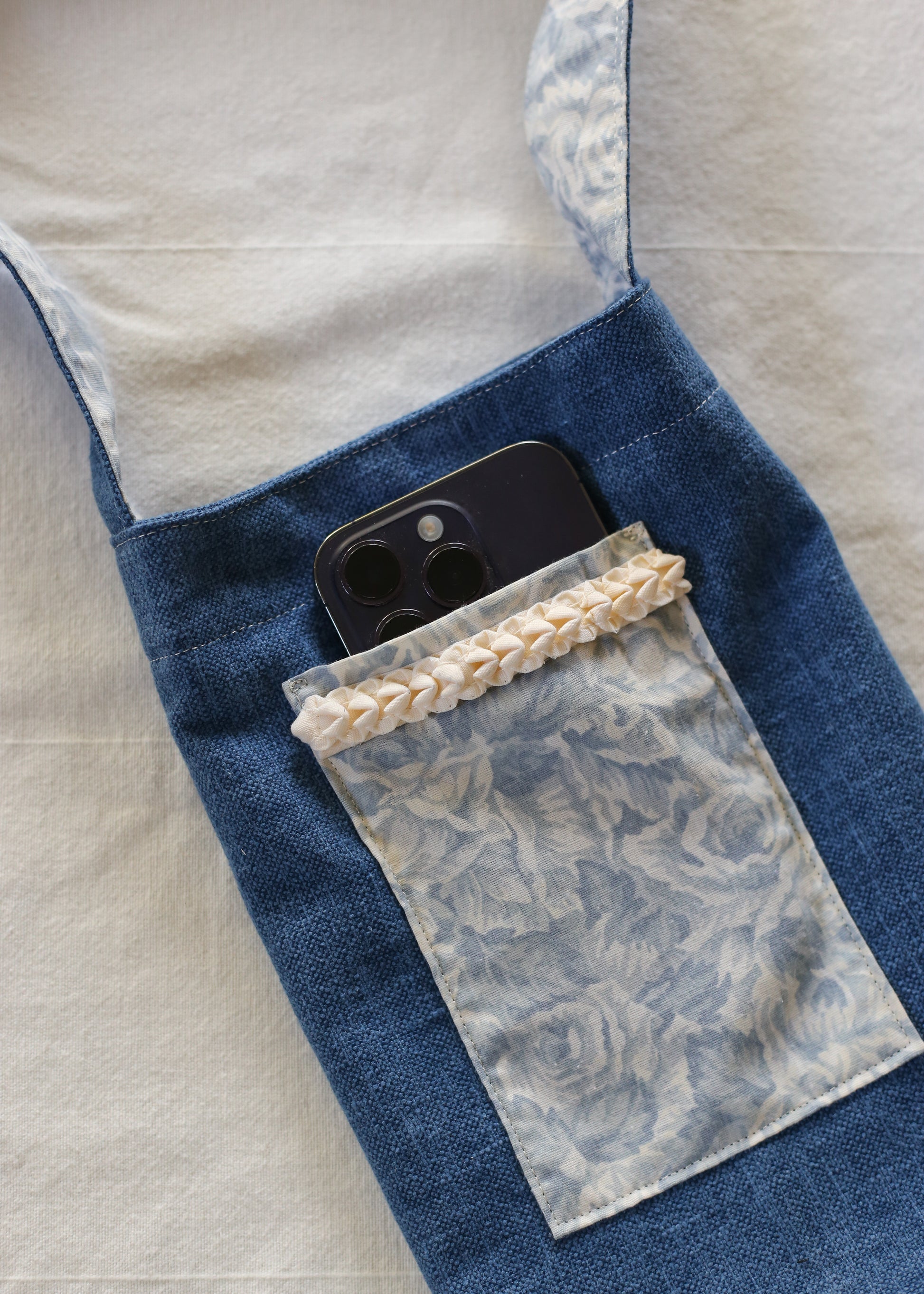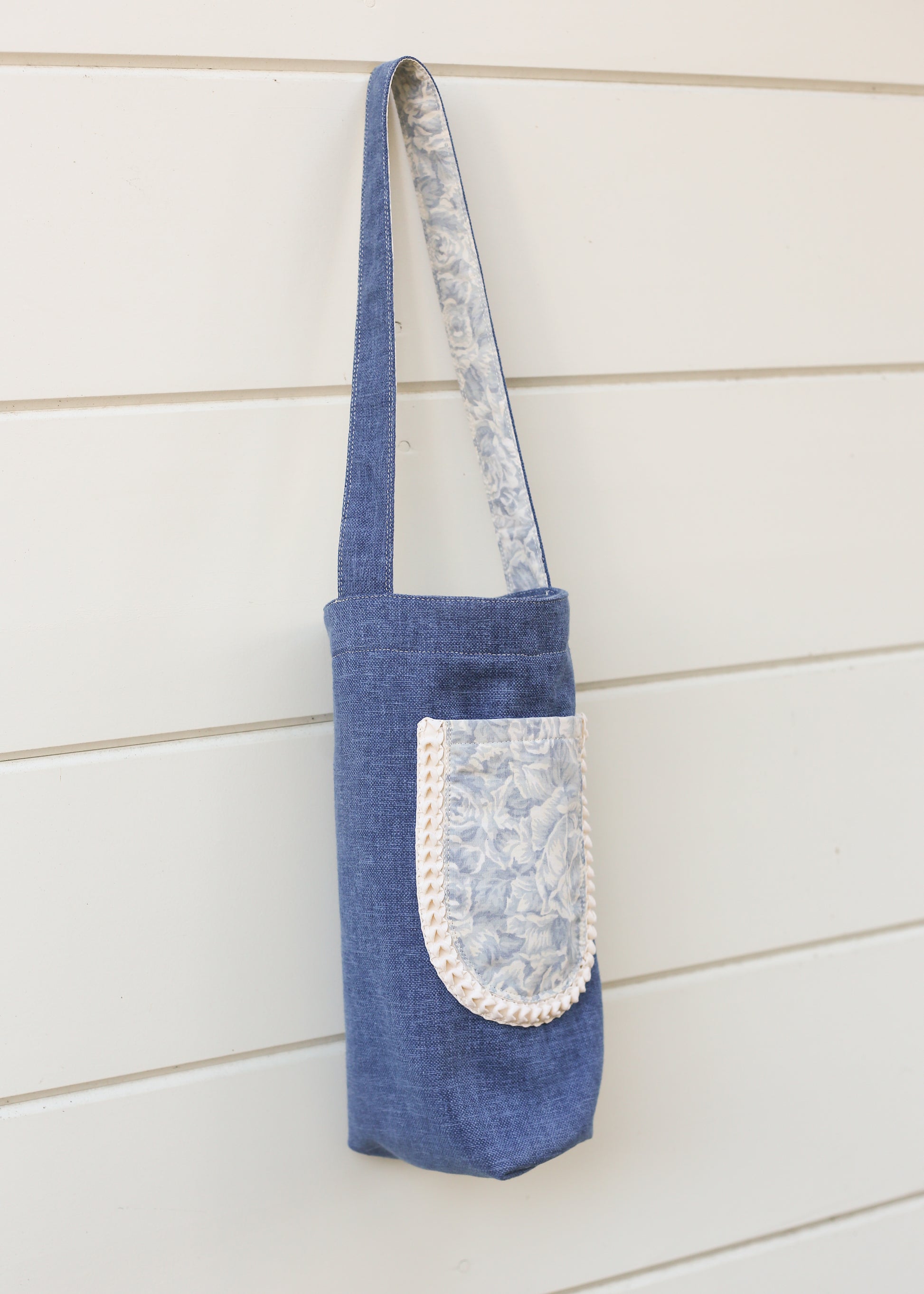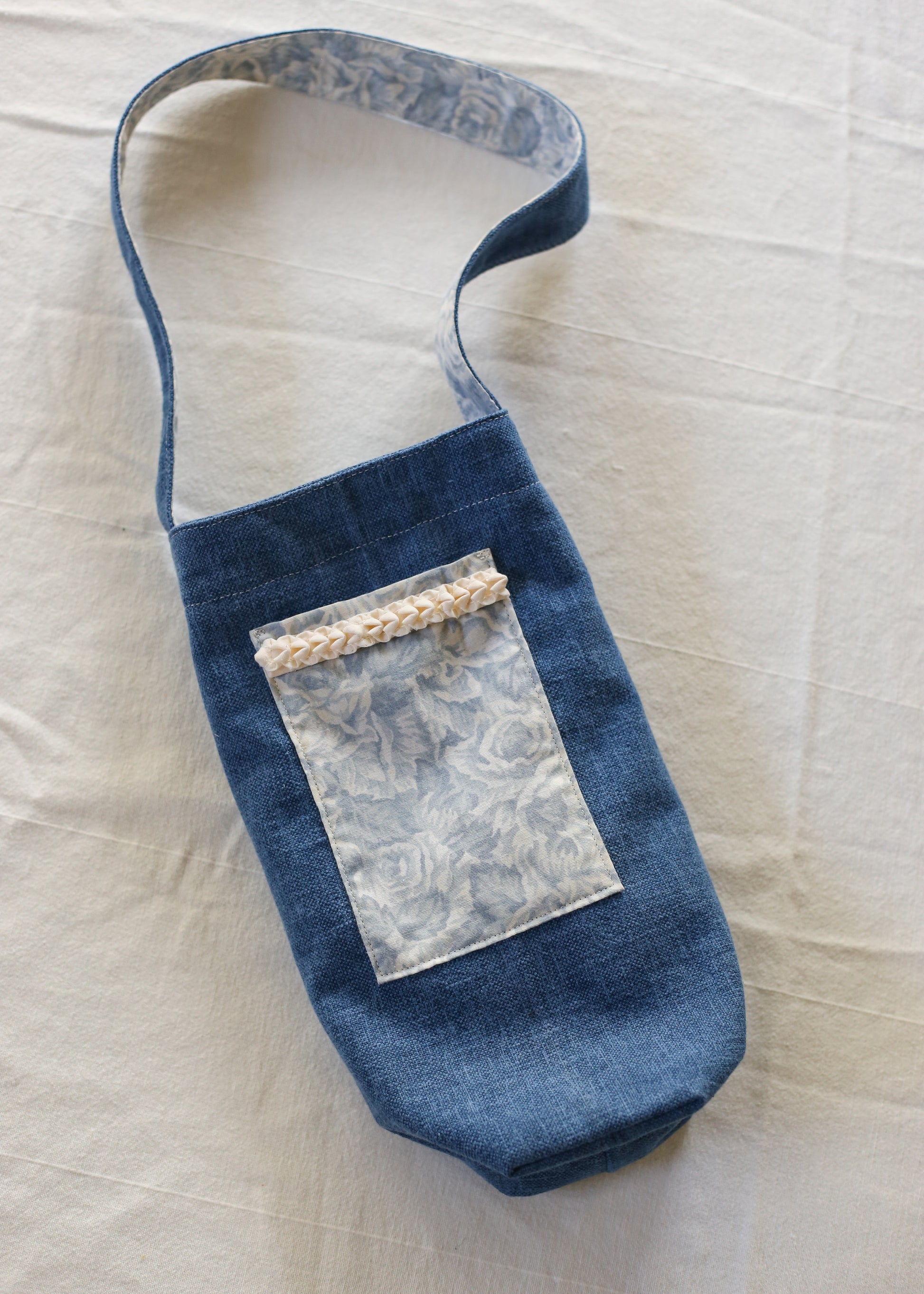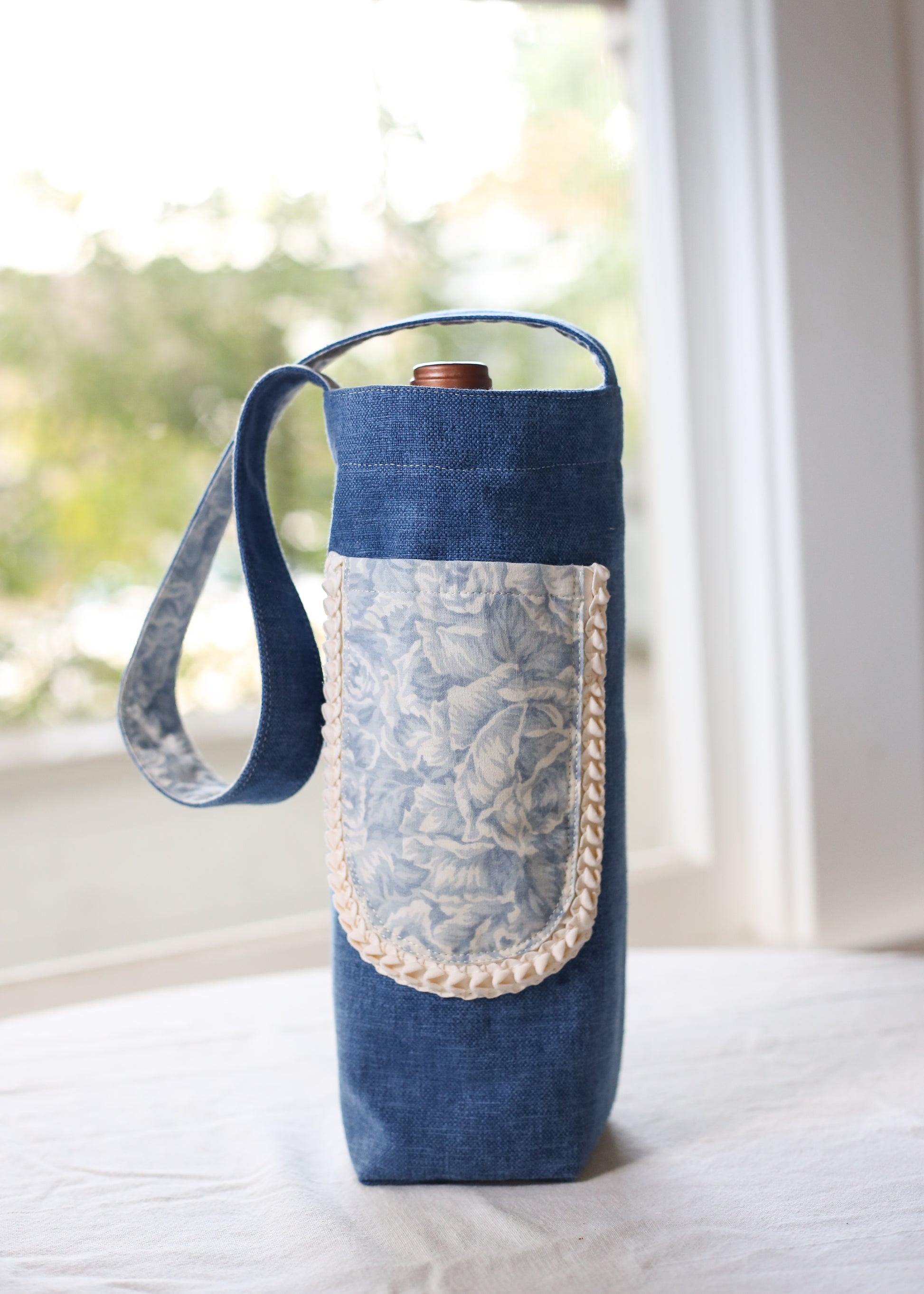 A one-of-a-kind, eco-friendly carryall for your favorite bottle! Crafted from a vintage denim curtain, it comfortably fits a wine bottle (or a large water bottle!) while the handy external pocket holds essentials. The shoulder strap offers comfort whether you're heading to a winery, the farmers' market, or just out for a picnic.
