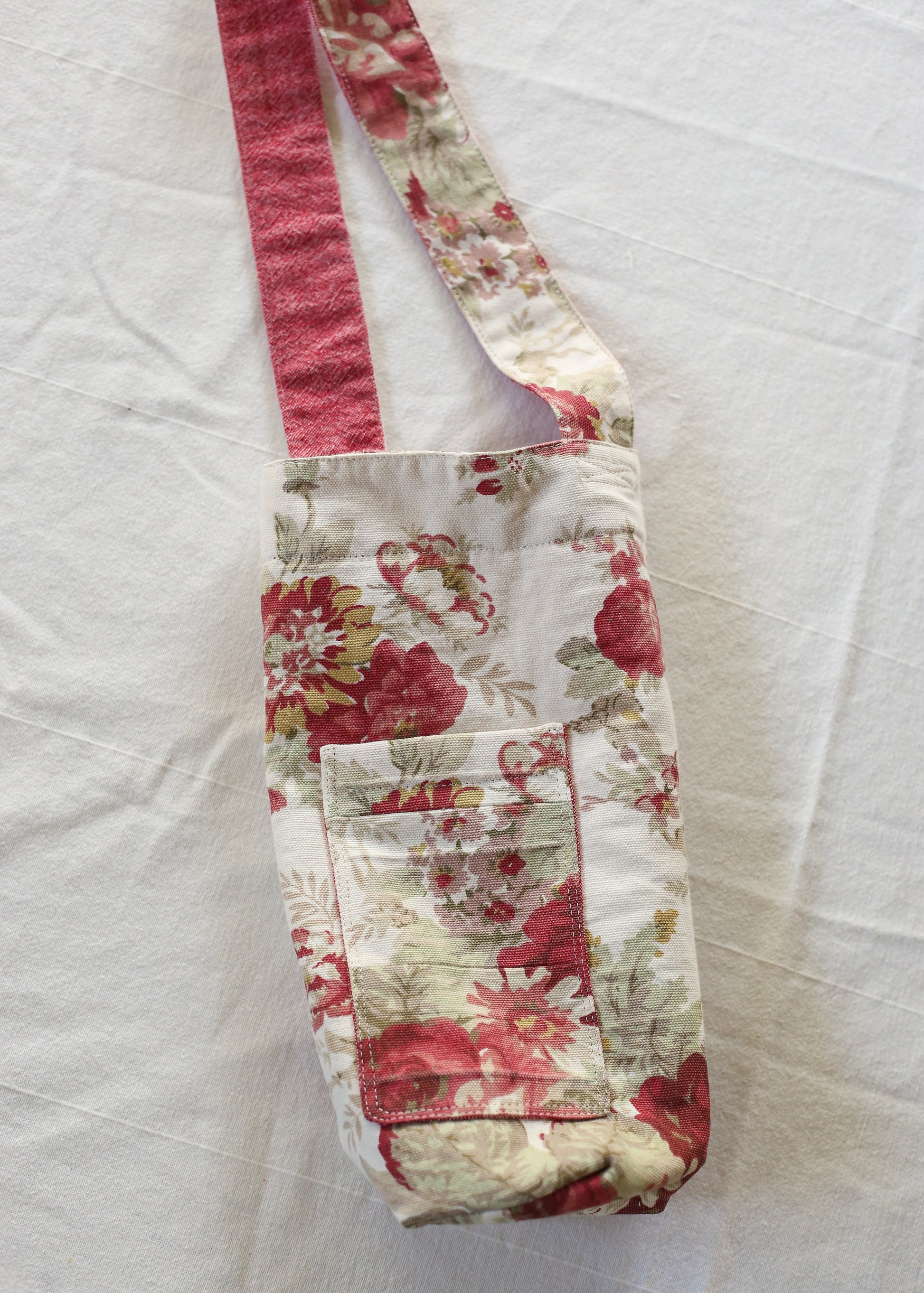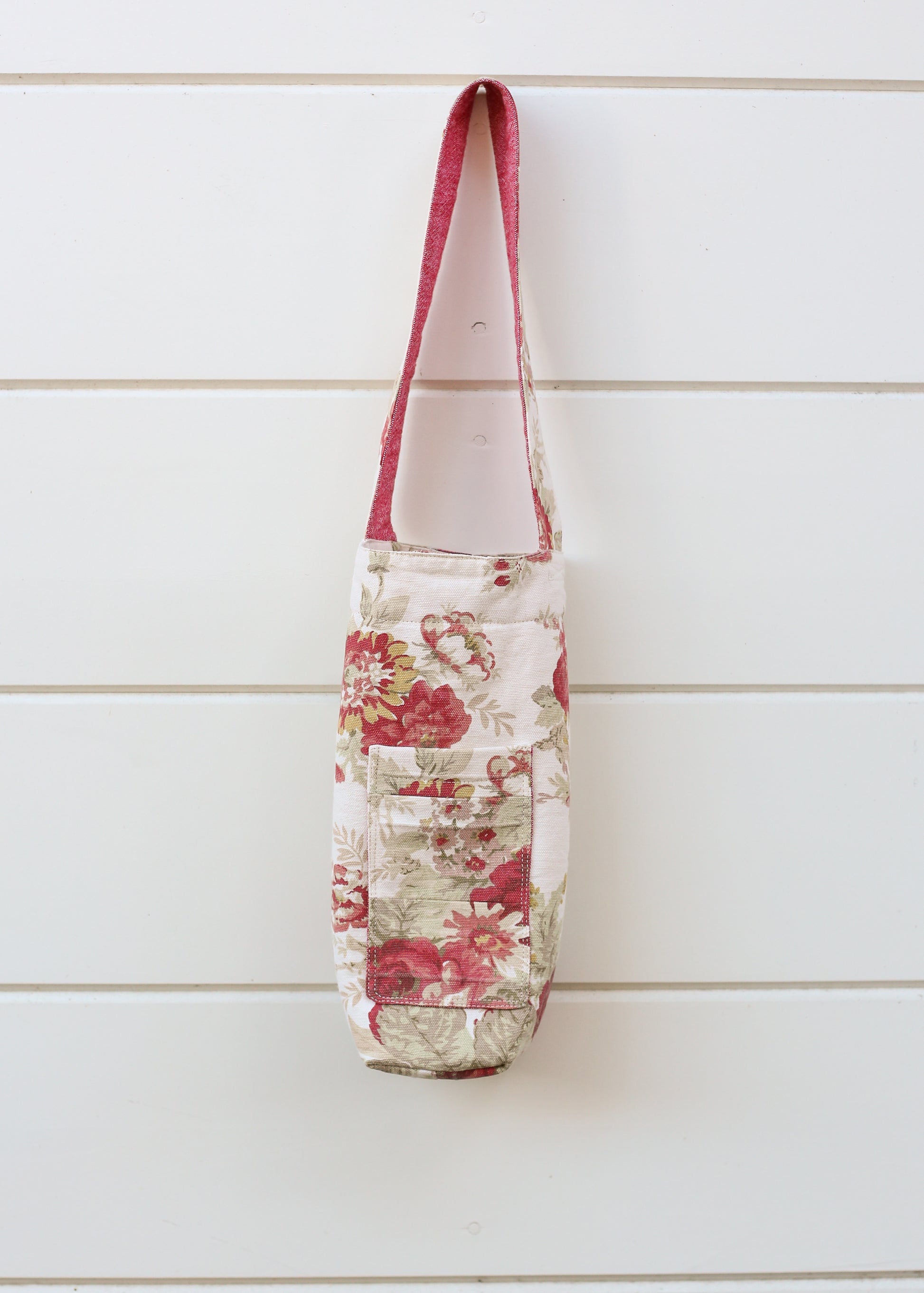 A one-of-a-kind, eco-friendly carryall for your favorite bottle! Crafted from a re-purposed vintage curtain, it comfortably fits a wine bottle (or a large water bottle!) while the handy external pocket holds essentials. The shoulder strap offers comfort whether you're heading to a winery, the farmers' market, or just out for a picnic.