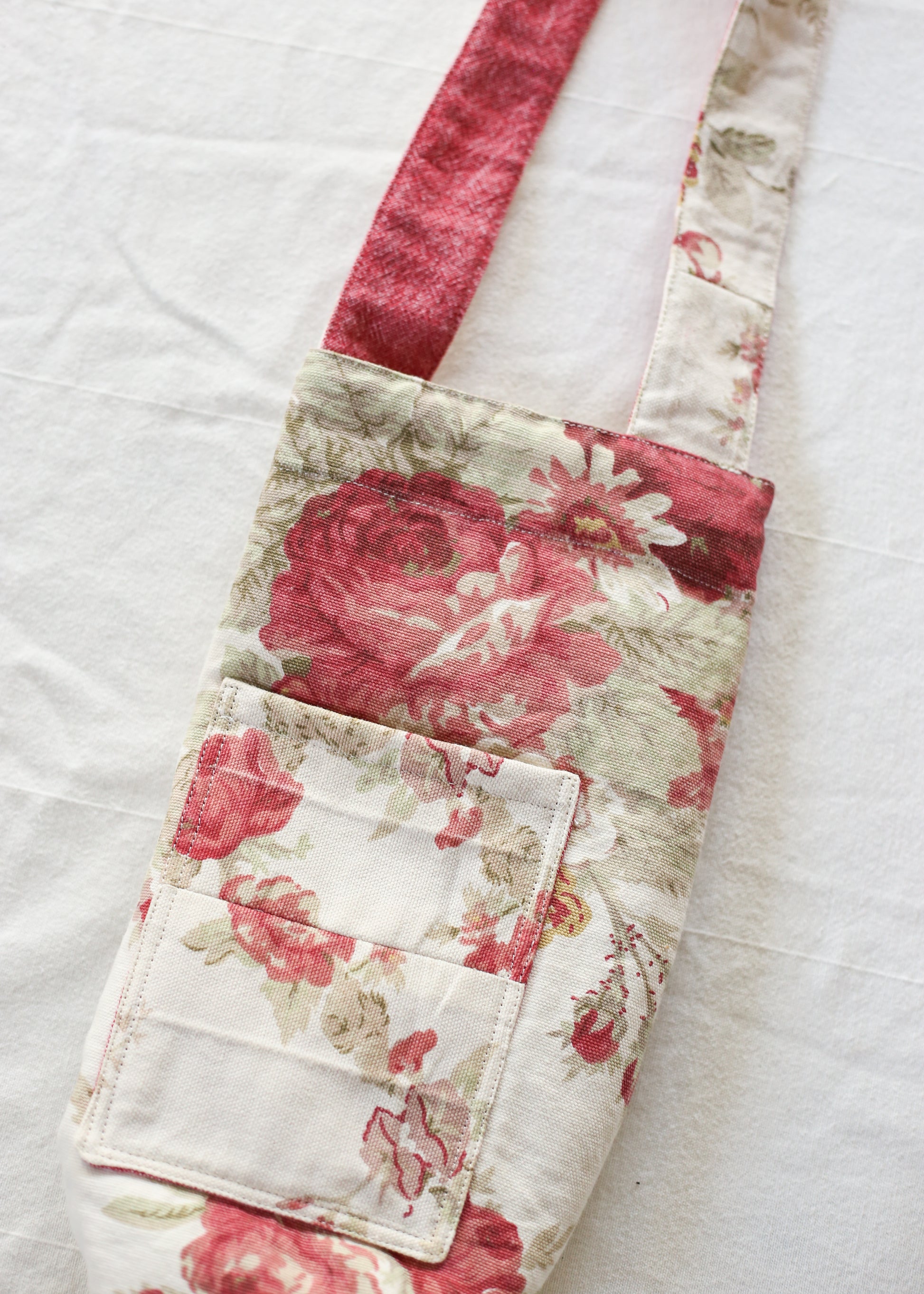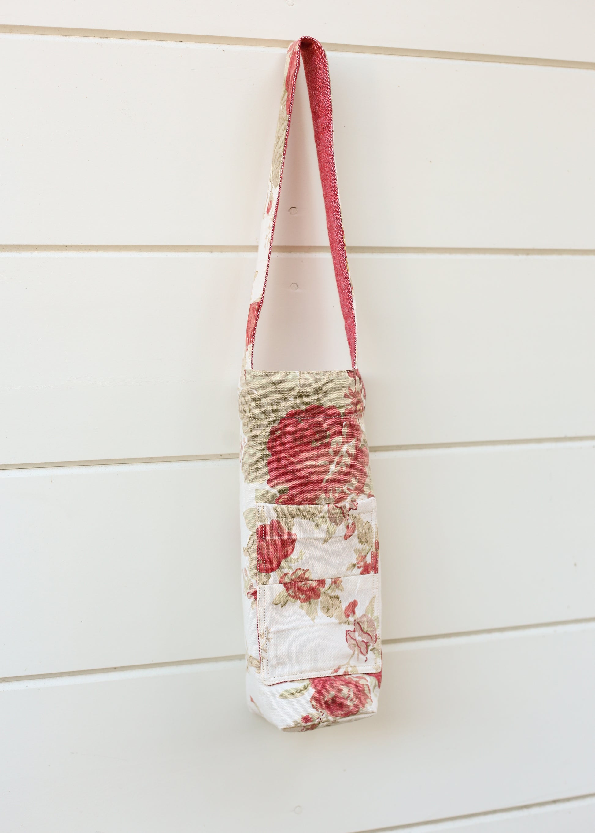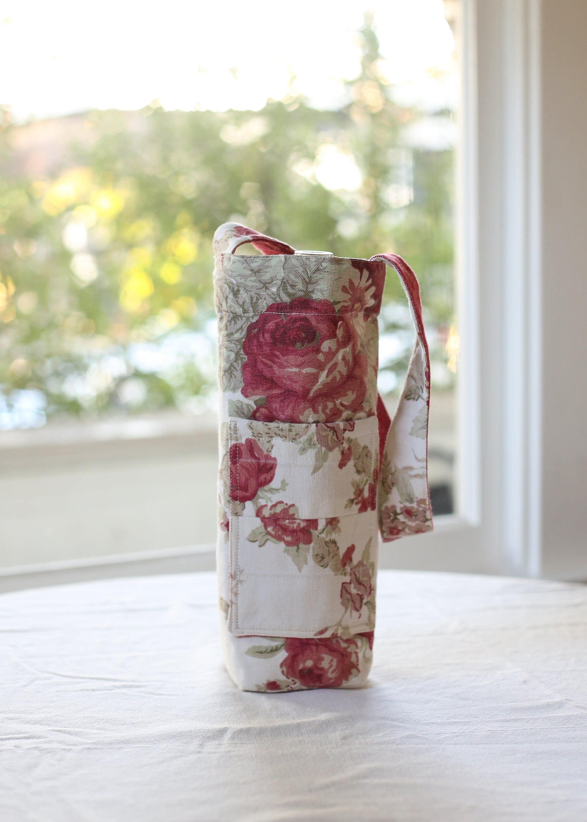 A one-of-a-kind, eco-friendly carryall for your favorite bottle! Crafted from a re-purposed vintage curtain, it comfortably fits a wine bottle (or a large water bottle!) while the handy external pocket holds essentials. The shoulder strap offers comfort whether you're heading to a winery, the farmers' market, or just out for a picnic.